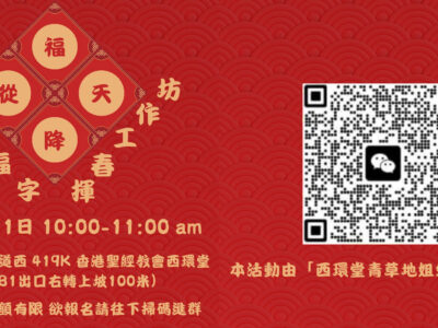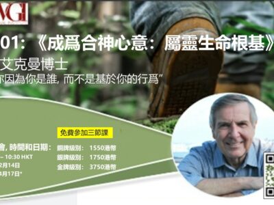 親自來發現父神的愛 邀請你參加大衛·艾克曼博士的BC101 “成為合神心意”課程。這門課包含12個章節的門徒訓練課程,已經在全球使用了25餘年。 經歷有效門徒造就和在基督 裡成長至關重要的12個真 理: 感恩和喜樂作為基督徒 成長的動力 我們在神眼中的價值 三一神的職能和事工 憑著信心和靠聖靈的引導而行 我們在基督裡的身份 如何應對我們的肉體和罪 禱告和事奉 視頻簡介: https://files.hkmbc.org/events/BC101chinese.mp4