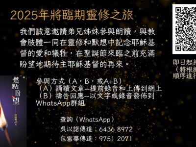 燃點盼望——將臨期 25 天 靈修特輯 序言:將臨期的終末涵意 主題一 醒悟 第 1 日 警醒的聖誕:迎接再來的君王 第 2 日 與罪一刀兩斷:預備迎接主再臨 第 3 日 警醒的等待 第 4 日 醒悟的聲音 第 5 日 將臨期反思:活出上帝的公平與公義 第 6 日 燈油滿溢的生命 第 7 日 覺醒:耶穌誕生對我的影響 主題二 悔改 第 8 日 真正的悔改 第 9 日 三面鏡子的悔改呼召 第 10 日 恩典中同行:群體關係的悔改與更新 第 11 日 心和口 第 12 日 回轉歸向上帝的恩典 第 13 日 在恩典和知識上長進 第 14 日 生命在「轉向」中重生