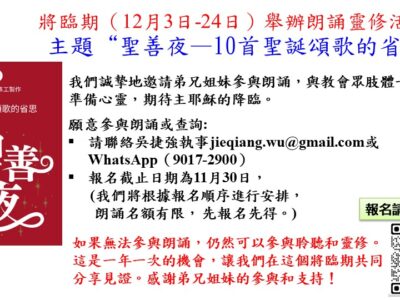 序言 https://files.hkmbc.org/events/2023將臨期朗誦靈修/序言-捷強夢嵐.mp3 第1天 https://files.hkmbc.org/events/2023將臨期朗誦靈修/第1天-華穎.mp3 第2天 https://files.hkmbc.org/events/2023將臨期朗誦靈修/第2天-Charlotte.mp3 第3天 https://files.hkmbc.org/events/20