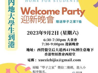 《學子之家》迎新會 西環堂 時間:9月2日 地點:香港西營盤皇后大道西419K號博仕臺地下 歡迎內地生來港“迎新晚會”,新老港漂一起吃吃喝喝、談天說地,認識香港,彼此認識! 期待新老港漂的到來!