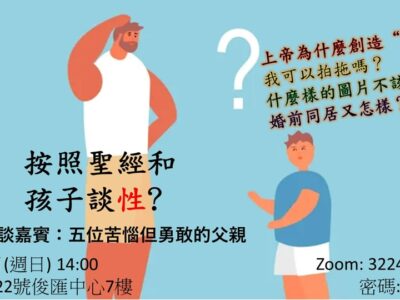 《信仰漫聊系列》 我們所處的世界充滿與性相關的信息,父母在當中可以如何參與塑造孩子們性觀念,積極談論兩性話題?在這期信仰漫聊,五位苦惱又勇敢的父親與大家一探究竟。9月17日(週日) 14:00 教會大堂。Zoom線上同步: 845 6640 2025,Passcode: 123456