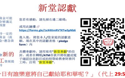 「今日有誰樂意將自己獻給耶和華呢?」(歷代志上 29:5下) 神是丰富的神,祂自己没有需要,却将各样的恩典,厚賜給眾人。大衛王曾想要為祂建聖殿,但神不容許,他說:「我心裡本想建造殿宇,安放耶和華的約櫃,作為我神的腳凳,我已經預備建造的材料, 只是神對我說:『你不可為我的名建造殿宇,因你是戰士,流了人的血。』」(代上28:2-3)可見得蒙神喜悅的大衛王,都沒有福份為神建殿。 在購買龍暉花園一事上,神藉著弟兄姊妹過往的奉獻,已經完成了;而在裝修、遷移的事上,依然有財務上的需要,我們盼望,這是神特別留給我們的機會,讓我們更加參與在神美好的聖工中。...