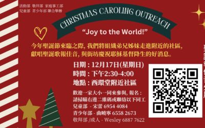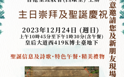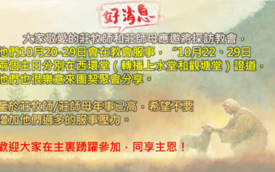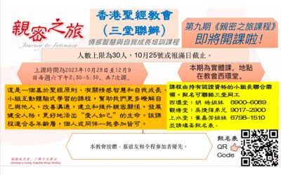 《親密之旅課程》 (三堂聯辦)第九期的親密之旅課程即將開課啦! 課程由美國西北大學臨床心理學家黃維仁博士創辦,是一個基於聖經原則、有關情感智慧和自我成長、小組互動體驗式學習的課程,幫助我們更多瞭解自己及他人,改善溝通,建立和提升親密關係,發展健全人格,更好地活出自由丰盛的生命。課程適合各年齡層,個人或同伴一起參加皆可。上課時間為2023年10月28日至12月9日每週六下午2:30-5:30,共7次課。本期为實體和綫上課,地點在教會西環堂。課程由持有認證資格的小組長聯合帶領。 報名可聯絡三堂同工:...