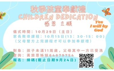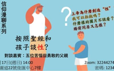 《信仰漫聊系列》 我們所處的世界充滿與性相關的信息,父母在當中可以如何參與塑造孩子們性觀念,積極談論兩性話題?在這期信仰漫聊,五位苦惱又勇敢的父親與大家一探究竟。9月17日(週日) 14:00 教會大堂。Zoom線上同步: 845 6640 2025,Passcode: 123456  ...