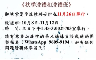 《親密之旅課程》 (三堂聯辦)第九期的親密之旅課程即將開課啦! 課程由美國西北大學臨床心理學家黃維仁博士創辦,是一個基於聖經原則、有關情感智慧和自我成長、小組互動體驗式學習的課程,幫助我們更多瞭解自己及他人,改善溝通,建立和提升親密關係,發展健全人格,更好地活出自由丰盛的生命。課程適合各年齡層,個人或同伴一起參加皆可。上課時間為2023年10月28日至12月9日每週六下午2:30-5:30,共7次課。本期为實體和綫上課,地點在教會西環堂。課程由持有認證資格的小組長聯合帶領。 報名可聯絡三堂同工:...