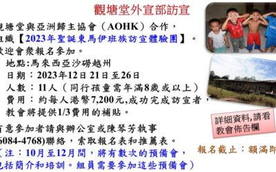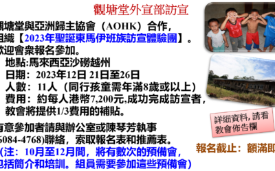 觀塘堂與亞洲歸主協會(AOHK)合作,組織【2023年聖誕東馬伊班族訪宣體驗團】。歡迎會衆報名參加。地點:馬來西亞沙磱越州。日期:2023年12日 21日至26日。人數:11人(同行孩童需年滿8歲或以上) 行程特點 由當地同工帶領全程,沿途分享當地現況及需要 實踐使命,明白上帝心意 參與海外宣教,體驗跨文化宣教生活 探訪伊班族長屋,體驗伊班族文化及生活 認識東馬來西亞教會,帶領聚會及與當地信徒交通 行程簡介 香港 à 吉隆坡 à 詩巫 à 探訪當地原居民...