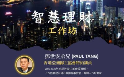 智慧理財 – 工作坊 鄧世安弟兄 (PAUL TANG) 香港亞洲歸主協會特約講員 如何訂定理財目標?聖經如何看理財? 如何在不同的人生階段建構財務規劃檔案? 有哪些基本的投資理財建議? 在財務方面神為我們劃下怎樣的疆界? 我們如何管理和善用擁有的財物和資源? 日期: 7 月23 及 30 日 下午 2:00-3:30 語言:普通話 地點: 觀塘堂 (大禮堂) 形式:現場及ZOOM ZOOM:870 9351 9549 密 碼:051577...
