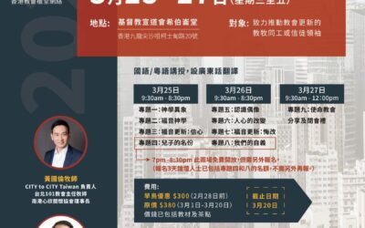 福音更新論壇 在瞬息萬變的時代中,香港教會在大環境的影響下正面對不少挑戰與考驗。然而,我們深信福音的大能從未改變,也堅信其更新和轉化的力量,藉着教會,將屬天的平安帶到城市的每一個角落。在逆境之中,我們更渴望看見眾教會彼此砥礪前行,在福音裡得力更新,忠心回應神在這城市的呼召。論壇內容涵蓋九個專題,從神學異象到實踐層面,盼能幫助教會在事奉與使命上得著更新與突破。 對象:致力推動教會更新的教牧同工或信徒領袖 講員:黃國倫牧師|CITY to CITY Taiwan 負責人、台北...