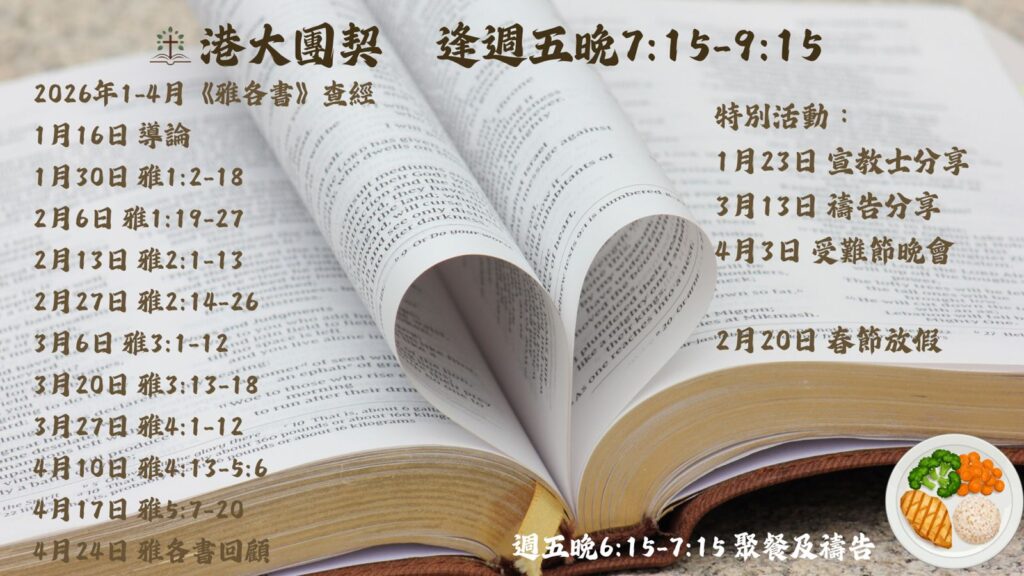 | 01/09 | 大食會 – 開年團聚 | 02/06 | 《雅各書》 |