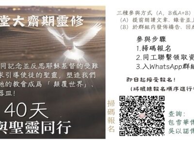 各位親愛的弟兄姊妹, 按照教會年曆的傳統,復活節主日往前推四十日(主日不算在内)的星期三稱為“聖灰星期三”(Ash Wednesday),從這日開始到復活節主日前,我們稱爲“大齋期”(又作“四旬期”或“預苦期”)。 今年大齋期從2月18日開始,教會選擇了靈命日糧事工製作的《40天與聖靈同行》,邀請弟兄姊妹透過朗讀、聆聽、回應的方式(每天5分鐘),一同記念並反思耶穌基督的受難與復活。 祈求引導使徒的聖靈,塑造我們每一位,成爲祂的器皿,使祂的教會成爲「 顛覆世界」、祝福世界的管道! 主題一:自省與悔改 第 1 日:你期待著什麼?  第 2