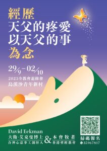 將於9月29日 (週五) 晚上至10月2日(週一)中午在烏溪沙青年新村營地舉行。今年退修會的主題是 “經歷天父的疼愛,以天父的事為念”。主要講員是大衛.艾克曼博士(Dr. David Eckman), 「成為合神心意事工」(Becoming What God Intended Ministries) 的創辦人,本會牧者也將與他配搭服事 。