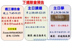 主內平安! 觀塘堂本周日主日崇拜的安排如下:
