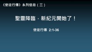 1 五旬節到了,門徒都聚集在一處。 2 忽然,從天上有響聲下來,好像一陣大風吹過,充滿了他們所坐的屋子; 3 又有舌頭如火焰顯現出來,分開落在他們各人頭上。 4 他們就都被聖靈充滿,按着聖靈所賜的口才說起別國的話來。5 那時,有虔誠的猶太人從天下各國來,住在耶路撒冷。 14 彼得和十一個使徒站起,高聲說:「猶太人和一切住在耶路撒冷的人哪,這件事你們當知道,也當側耳聽我的話。 16 這正是先知約珥所說的: 17 『神說:在末後的日子,我要將我的靈澆灌凡有血氣的。你們的兒女要說預言;你們的少年人要見異象;老年人要做異夢。18 在那些日子,我要將我的靈澆灌我的僕人和使女,他們就要說預言。19 在天上我要顯出奇事,在地下我要顯出神蹟,有血,有火,有煙霧。20 日頭要變為黑暗,月亮要變為血;這都在主大而明顯的日子未到以前。21 到那時候,凡求告主名的,就必得救。』32 這耶穌,神已經叫他復活了,我們都為這事作見證。 33 他既被神的右手高舉,又從父受了所應許的聖靈,就把你們所看見、所聽見的澆灌下來。36 「故此,以色列全家當確實地知道,你們釘在十字架上的這位耶穌,神已經立他為主,為基督了。」