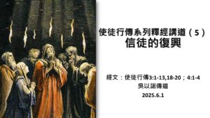 (4:1-4) 1 使徒對百姓說話的時候,祭司們和守殿官並撒都該人忽然來了。 2 因他們教訓百姓,本着耶穌,傳說死人復活,就很煩惱, 3 於是下手拿住他們。因為天已經晚了,就把他們押到第二天。 4 但聽道之人有許多信的,男丁數目約到五千。