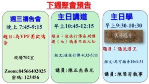 主內平安!  觀塘堂本周日主日崇拜的安排如下: