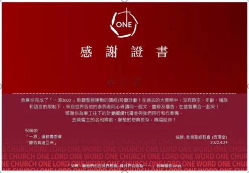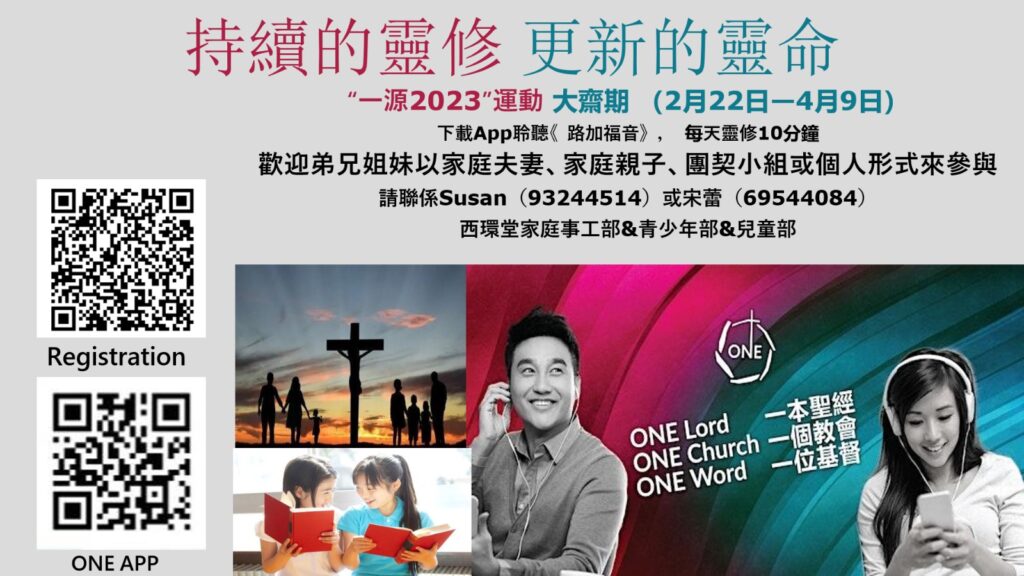 自2022年3月2日至4月17日的大齋期期間,也正值香港面對嚴峻的第五波疫情猛烈衝擊,教會許多弟兄姐妹被迫在家辦公,家庭事工部和兒童部聯合推廣的“一源”聆聽聖經活動為很多家庭提供一起靈修的機會,讓神的話語帶給每個家庭盼望、平安與愛。