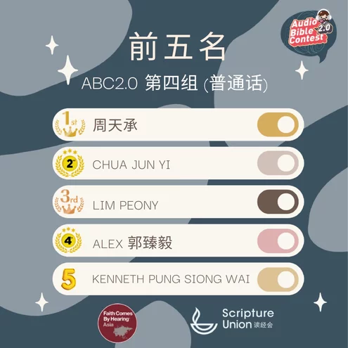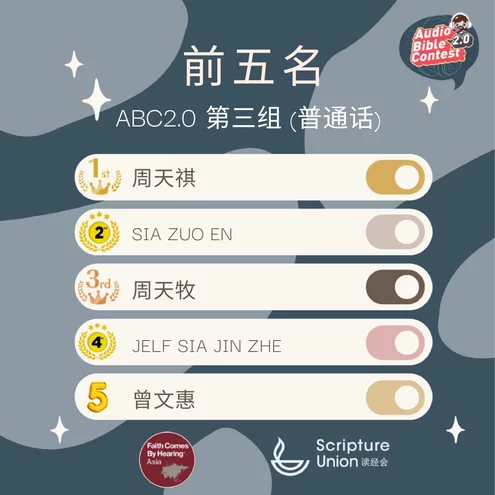 🎉🎉🎉🎊🎊🎊好消息!在7月23日由“聽信真道”舉辦的國際聆聽聖經比賽(ABC 2.0)中,代表香港聖經教會的5位青少年和兒童,分別參加了4個組別的比賽(路加福音),並在來自馬來西亞、新加坡、香港等地眾多選手中脫穎而出,獲得全部該4個組別的第一名和一個第三名! 🏆🏆🏆孩子們通過比賽增強了學習聖經的興趣,帶動他們在真理上紮根!感謝讚美主! 🌱🌱🙏🏻🙏🏻